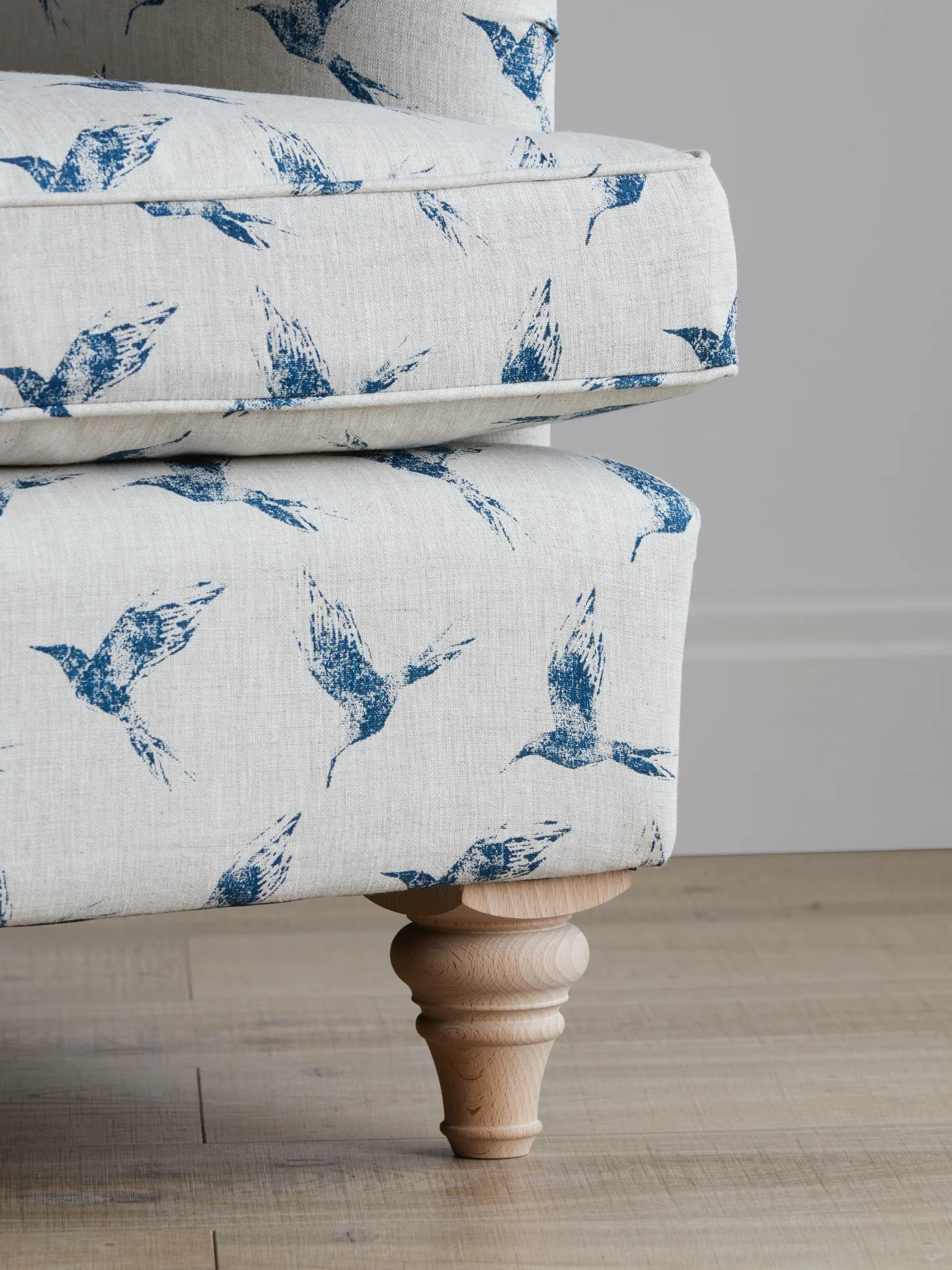 We’ve kept it traditional in this styling, with the delightful Bollin Bird fabric and natural beechwood legs.